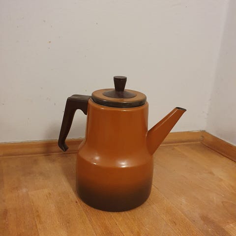Emaljekande, metal,i retro design. Kan sættes på kogeplade og bruges som kedel. Pæn indvendig.