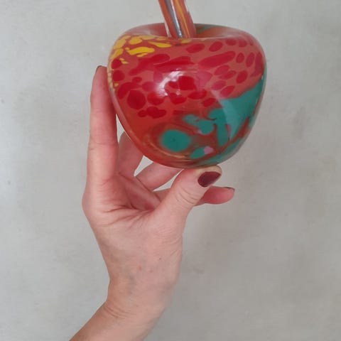 Måler ca 3x3 cm i selve æblet, bladet måler 3x2,50 cm