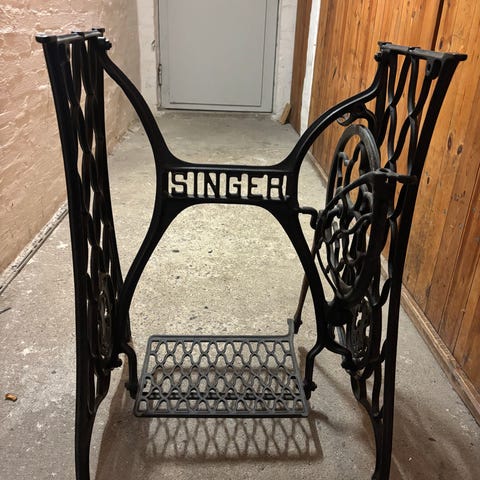 Gammel Singer symaskine hvor symaskinen kan gemmes væk under bordpladen. Derfor kan den bruges som et lille bord til f.eks. en lampe eller til planter.