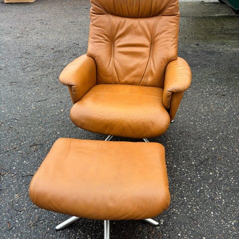 Den har høj ryg, gode armlæn og leveres med tilhørende fodskammel, så man kan sidde behageligt i længere tid.