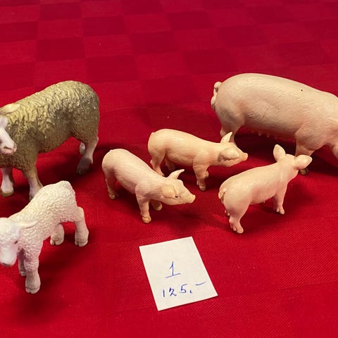 Schleich Dyrefigurer sæt bestående af tre geder, en sort-hvid gris og en sort-hvid kanin. Figurenes materialer er plast, og de er designet til børn til leg og samling.