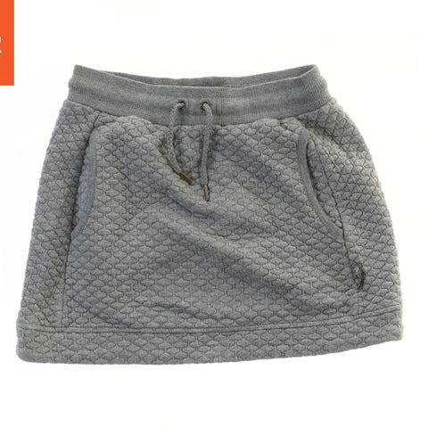 En grå nederdel med små sorte prikker. Nederdelen har en elastisk talje med en snor. Materialet ser blødt ud, og der er ingen synlige lynlåse eller lommer.