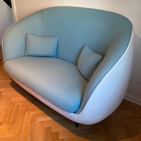 Flot kupésofa fra FourDesign, model FourUs Booth. Sofaen er polsteret mørk uld og sædet er i kunstlæder.
