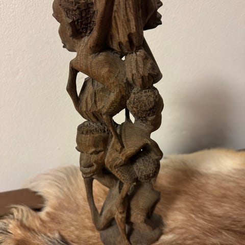 Sjov og dekorativ figur i træ med tre hoveder der kan bevæge sig op og ned, så det ligner en flok giraffer der løber.