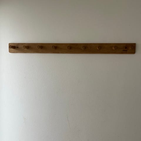 Smuk knagerække i egetræ med hylde.