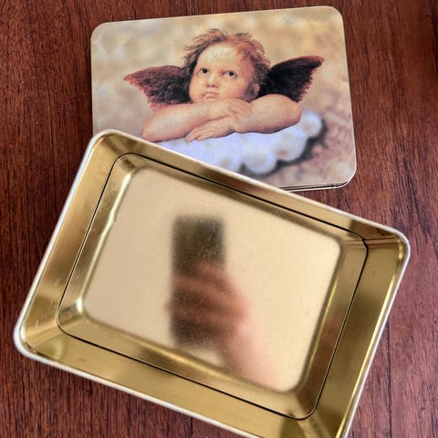 Fin firkantet dåse med et låg der sidder fast på dåsen. På siderne er der motiver af store smukke roser i hvid, gul, rød, lyserød (måske hunderoser / strandroser / hybenroser).