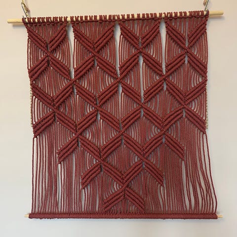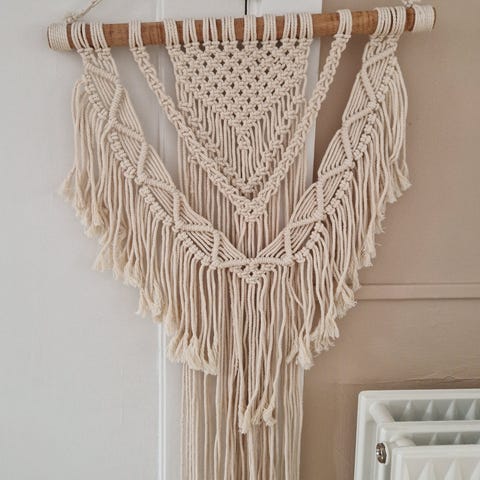 Håndlavet unika macrame vægtæppe i genbrugsbomuldsreb og fyrretræ. Mål: 40x60 (uden træpind)