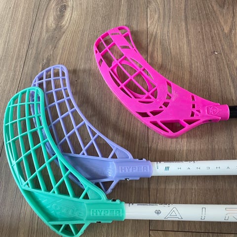 Sense HES 30 floorballstav grå/hvid med lilla blad. 92cm. Staven er mærket: Opti light X OXDOG Den anden stav er neongul med sort blad. 92cm. Stav mærket UNIHOE CAVITI Z F32. Beskyttelsesbriller ( er solgt ) og hvid bold er incl.