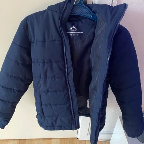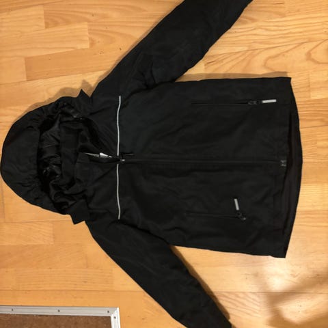 Vinterjakke med hætte, lommer og vindstopper ved håndled. Kommer fra et ikke dyre og ikke ryger hjem