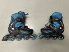Rulleskøjter, California, str. 32, Rulleskøjter / inlinere str. 32 med fire hjul på hver skøjte. Bagbremse på højre fod. Kunne engang stilles i str. 32-35, men den ene knap til det er gået i stykker, derfor den lave pris. Ellers i god stand og desværre ikke meget brugt.