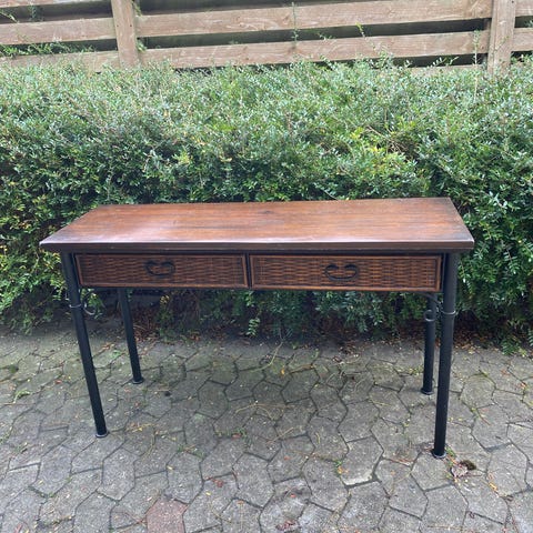 Fint mindre skrivebord eller lign. Med plade i eg og metalstel på hjul.