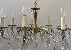 original gammel prismelysekrone (ca. 100 år gl.) i messing / messing-hvid / glas, med mange prismer, 7 arme og mange fine detaljer.