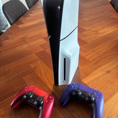 Næsten ny Sony PlayStation 5 med to matchende DualSense-controllere. Ledningerne er ikke afbilledet, men følger selvfølgelig også med. Brugt sammenlagt maks. 10 timer og sælges udelukkende fordi den ikke bliver brugt. Fast pris.