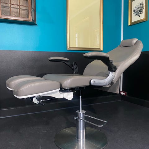 Fed retro stol med manuel fodpumpe, kan hejses, lægges ned , fodstøtter kan forlænges. Kan rettes helt ud og bruges som massage briks