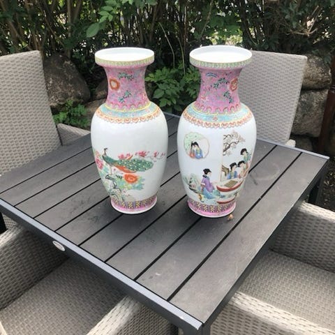 2 antikke vaser i messing fra ultimo 19. årh til primo 20. årh. dekoreret med slyngede drager samt indgraveret tegninger på korpus i form af fugle og blomster.