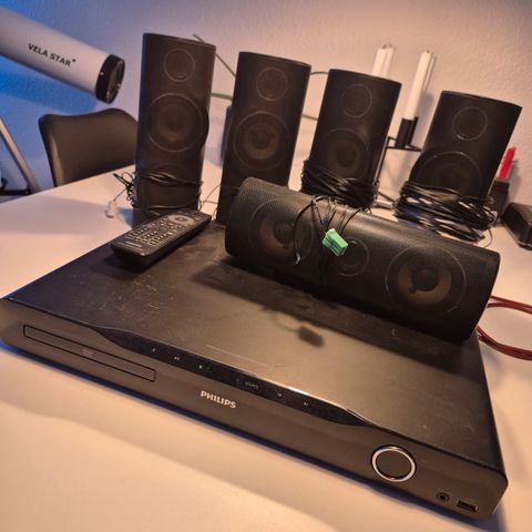 Sony HBD-ZF150 hjemmekinopakke med to høye høyttalere, en subwoofer og en Blu-ray-spiller. Enhetene har svart farge og tilbyr lydsystem for hjemmeunderholdning.