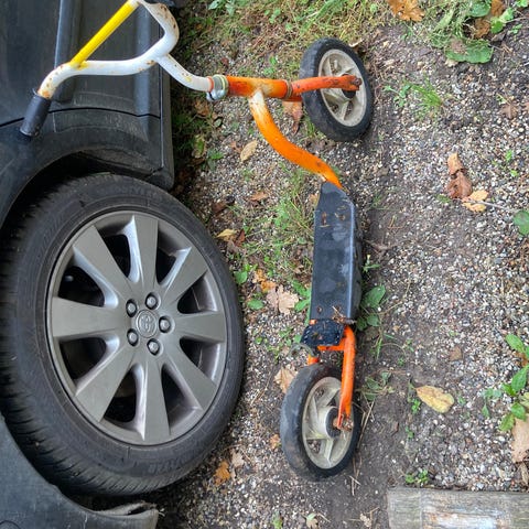 Super fedt retro løbehjul fra 60erne med en masse patina , nogen vil huske det fra de var børn ( incl mig selv ) , der er ridset ind i det på kronrøret at det tilhøre ( arno😊) tænker det er fra børnehave el skole tiden , dæk er ik i så go stand men ringeklokken virker stadig og det gør bremsen osse 😁