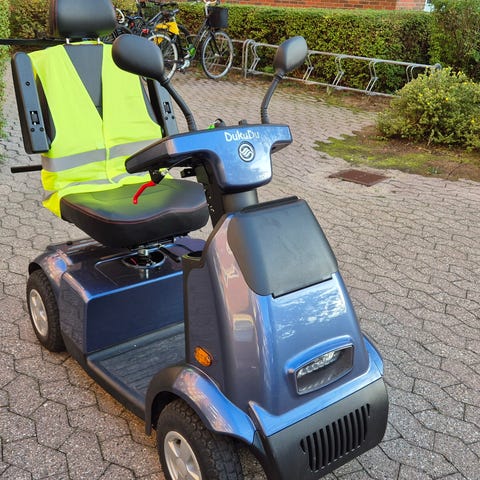 Dukadu el-scooter model Go-el 270 i flot stand med lavt antal kilometer kørt - kun km 418. Den er købt i Sep 2021. Nypris kr 24.995. Der medfølger fuld-dækken til scooteren. Bagagekurv med lås bag-på samt bagagekurv med lås foran. Desuden medfølger der regnslag/dækken til føreren. Topfart er 17-18 km. Bemærk at scooteren har 4 hjul for bedre stabilitet. Kan ses og prøves i Brøndbyvester efter aftale. Kun seriøse henvendelser. Bytte har ingen interesse.