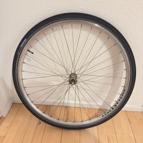 Robust forhjul med fælg i flot blå/aluminium design. Monteret med Shimano rullebremse (skivebremse-type) – pålidelig og næsten vedligeholdelsesfri bremseteknologi.