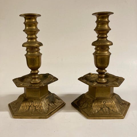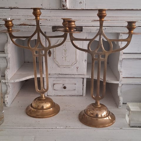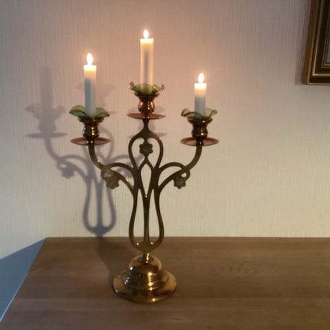 To meget smukke messing kandelabre! Antikke, men i super god stand. Alle med messing asietter i toppen. De har en masse fine mønstre og krummelurer.