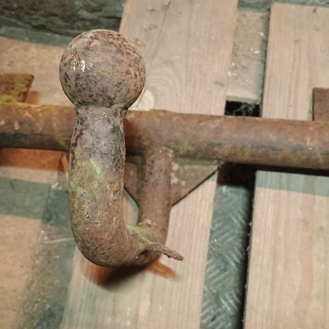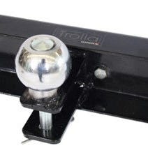 Ukendt mærke trækugle til anhænger med metalkonstruktion og rund kugleform. Anvendes til tilkobling af anhængere til køretøjer. Kuglen er rustik og viser tegn på brug.