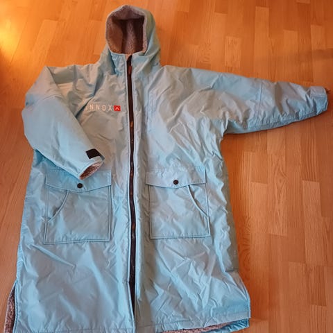 Maison unisex langærmet vinterbade-kåbe i størrelse XL, lavet af 100% bomuld. Vinterbadekåben har farver hvid/blå i stribet mønster og en stor frontlomme. Materialet er OEKO-TEX Standard 100 certificeret, hvilket sikrer tekstilernes sikkerhed. Velegnet til at tørre/varme sig i efter vinterbadning, nem at få over hovedet, kan også bruges til afslappet brug og forskellige sportsaktiviteter.