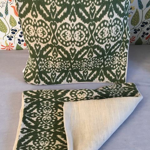 Skønt, grønt pudebetræk med brune hjerter og brune pompons langs kanterne.