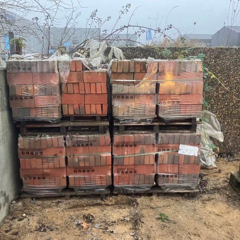 Mursten i overskud fra nybyggeri. Mursten hedder Unika Atlas. Der er 1920 styks indpakket og på paller og nogen løse sten. De skal afhentes i 9600 Aars.