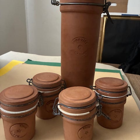 To opbevaringskrukker til opbevaring af grønt, løg, hvidløg eller lign. Dekorative olien på krukkerne. Mål: højde 15,5 cm og radius 11,5 cm.