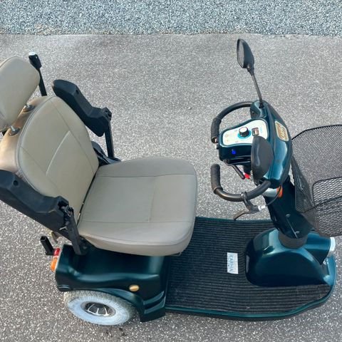 Elektrisk scooter med kurv foran, justerbart sæde med nakkestøtte, 3 hjul og skridsikkert fodstøtteområde. Oplader og manual medfølger. Rækkevidde op til 50 km med op til 15 km/t. Nypris 25.000 kr. Sælges til kr. 3.000. Nye batterier leveres monteret til kr. 2.000.