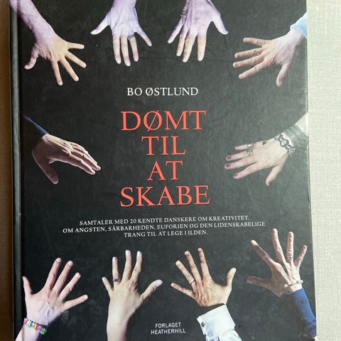 Bo Østlund Dømt til At Skabe bog med sort omslag. Indeholder bidrag fra flere herunder Anja Andersen, Peter Bo Bendixen og andre. Bogen er skrevet på dansk og indeholder tekster og illustrationer relateret til kunst og kultur.