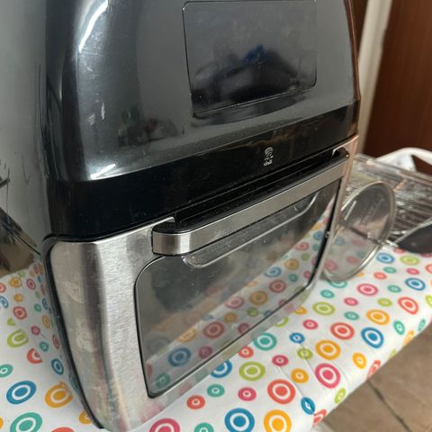 HOLM Deli Airfryer ovn 12 liter i sort farve med kompakt design, gennemsigtigt låg og aftagelige dele, herunder en rist, bundbakke, gitterkurv og en roterende rotisseri-spyd. Velegnet til tilberedning af forskellige retter ved brug af varmluftsteknologi.