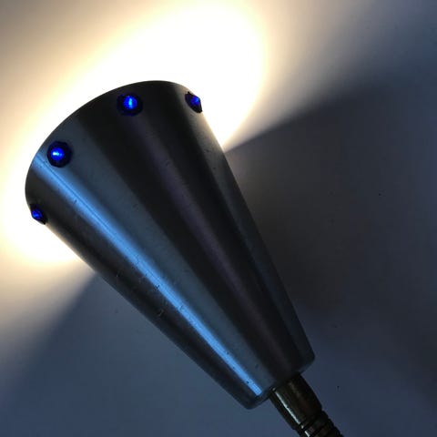 Retro lamper fra 1950erne. Larkeret messing og aluminium. Lyseblå. Pæn stand og med aldersrelateret brugsspor.