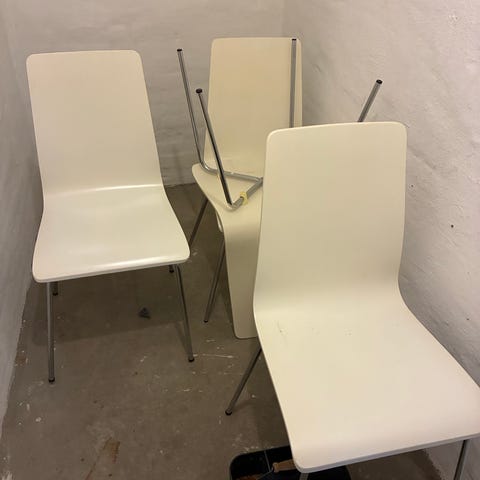 Hvide Ingolf stole fra Ikea, 4 stk, få brugsridser/spor, sælges samlet for 400 kr. (100 kr stykket). Nypris 1980 kr.