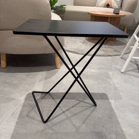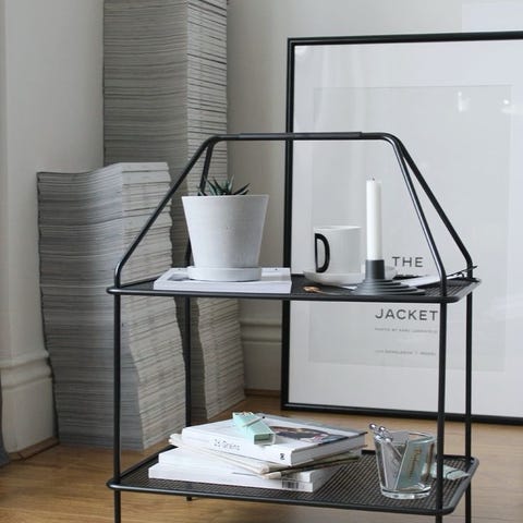 Designet i pulverlakeret mørkegrå stål, med to hylder og lav vægt – let at flytte rundt