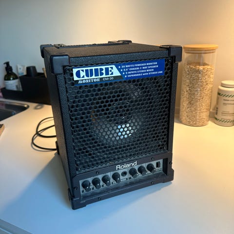 Sælger denne Roland mobile cube. Havde for nogle år siden, en idé om at jeg skulle prøve at spille på gaden, men det blev ikke til noget synderligt. Derfor skal den videre. Det kan også bruges som øve forstærker. Der medfølger ikke strømforsyning, men den kan køre på 6 AA batterier.