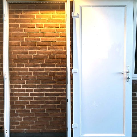 Facadedør i plast med 3-lags cotswold. Døren har lavt alu-bundstykke. Håndtag, lås mm. medfølger. Udvendigt er der rød træstruktur malet på plastikken. Døren er produceret i Rehau VC profiler.
