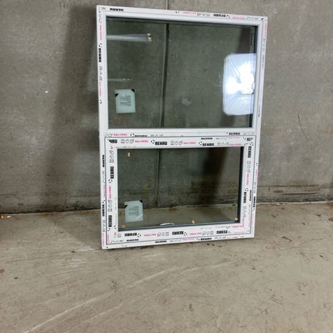 Topstyret vindue i plast med 3-lags energirude. Rødmalet til at ligne træ udvendigt. Produceret i Rehaus PVC profiler.