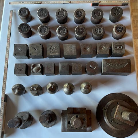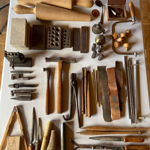 Sjældne røde stager, stempler og forskelligt værktøj, som har tilhørt én af Georg Jensens sølvsmede.