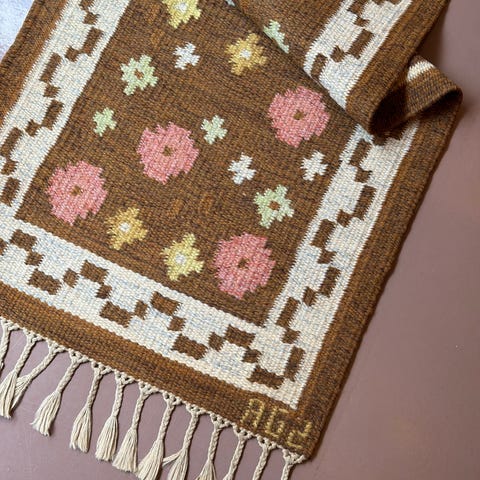 Vintage rolakan, flat weave rug by Ingegerd Silow (Signed IS)A Swedish hand-woven flatweave wool rug with a beautiful colour palette that includes brown, yellow, pink, cream, green and white nuances. L230 x W170 cm Sweden 1950sGood vintage condition, minor signs of age and wear.