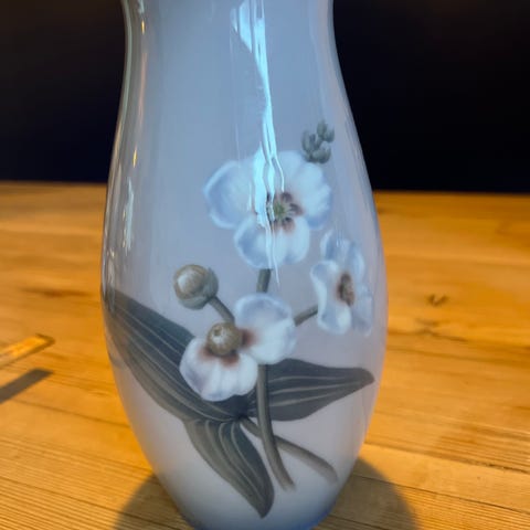 Bing & Grøndahl porcelænsskål med blomsterdekoration. Skålen har en bølget kant og er fremstillet i hvidt porcelæn med håndmalet blomstermotiv i grønne og hvide nuancer. Skålen er velegnet til servering eller som dekorativ genstand.