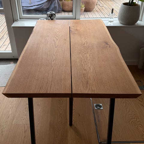 Snedker lavet spisebord i ovntørret egetræ med natur kanter samt sorte HAY ben. Snedkeren hedder “CKI snedkeri”.