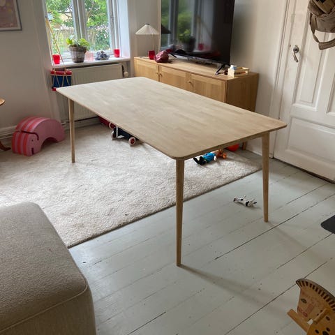 Det er egetræ og har dermed en masse naturlig charme. Har også brugsspor, så jeg vil anbefale en slibning og en ny omgang olie. Olie kan evt. medfølge. Vi sleb det selv forrige år.
