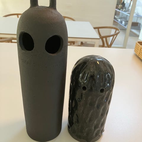 Skulpturerne er henholdsvis en kvindelig og mandlig torso. I smukke grålige nuancer. Højde 50 cm.