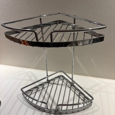 Elegant hjørnehylde i pulverlakeret rustfrit stål, designet til at tåle fugtige badeværelsesmiljøer.