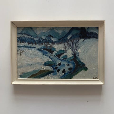 Oliemaleri af vinterlandskab.