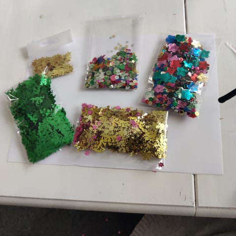 små krukker med glimmer og stjerner, hvid, sølv, pink og sort. Prisen er for alle sammen, sælges kun samlet, fast pris.