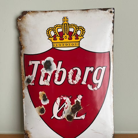 Tuborg Københavns Emaljeværk emaljeskilt med motiv af en grøn tuborg med guldkapsel. Skiltet er lavet af emalje og viser tydeligt Tuborg-logo og flaskens detaljer. Skiltet har brugsspor og rust, hvilket indikerer alder og tidligere brug.