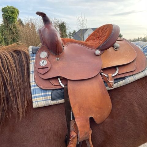Jeg sælger denne antik (håndsyet) børne western sadel, jeg har selv redet med den, men de sidste 4 år, har den stået i min stue