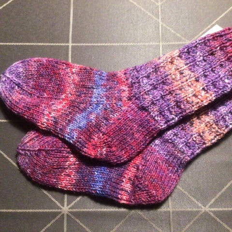 Hjemmestrikkede sokker af 75 % uld og 25 % nylon.